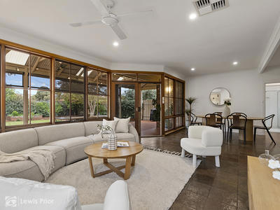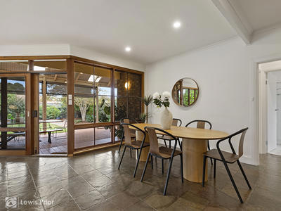 Centrally positioned, the updated kitchen is well-appointed with quality appliances including a Siemens wall oven, Miele dishwasher, gas cooktop and temperature-controlled hot water, all complemented by expansive stone benchtops and a generous breakfast bar. The adjoining open-plan living and dining area is bathed in natural light through striking floor-to-ceiling timber windows, creating a welcoming space for everyday living. Comfort is enhanced with ceiling fans, LED downlights, split system air conditioning, ducted evaporative cooling and the added benefit of a 5.4kW solar system.